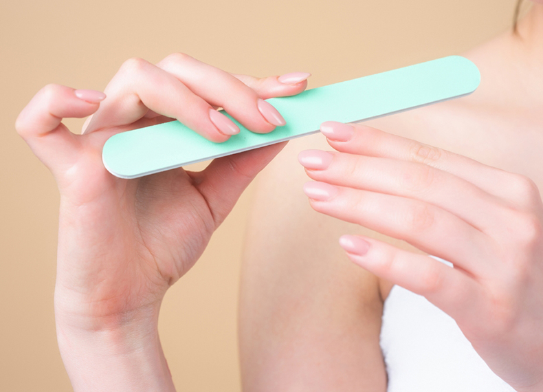 爪切りではなくエメリーボードで長さを整えるのがおすすめです。自然な丸みに整える場合は、爪に対して45度の角度で当て、