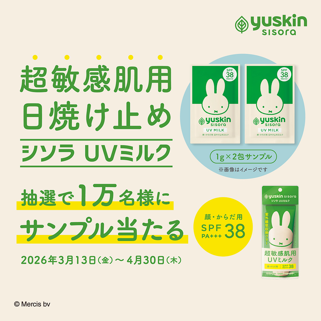 超敏感肌をやさしく守る「シソラ UVミルク」のサンプル(1g)を抽選で1万名様にプレゼント! 「私の肌に合うかな?」と不安な方も、まずはサンプルでお試しください。【応募締切:4/30(木)】
